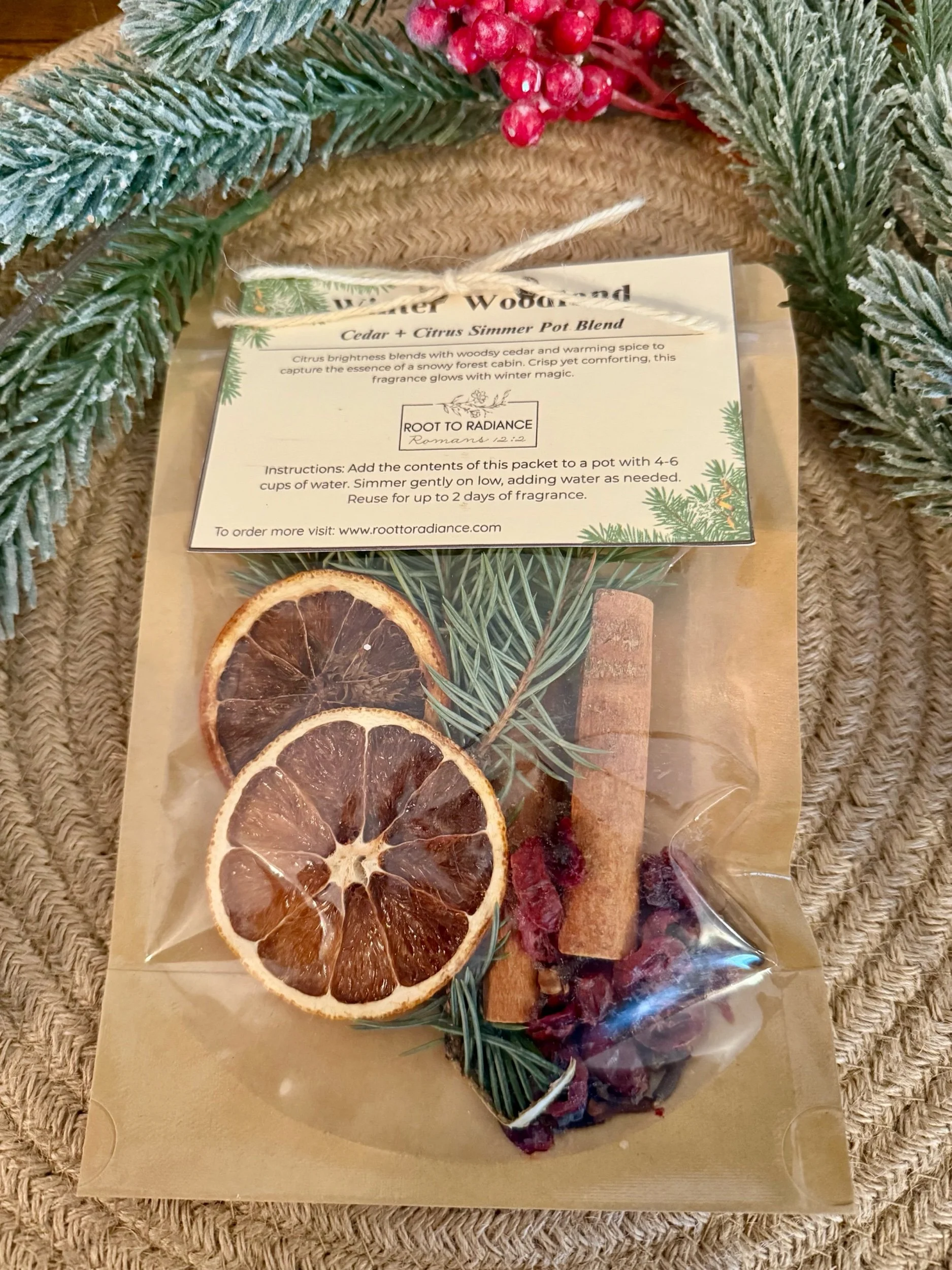 Bring the magic of the season into your home with our Winter Woodland Simmer Pot Blend. This handcrafted mix captures the essence of a snowy forest cabin—where bright citrus meets comforting cedar, warm spices, and a touch of winter magic. As it gently simmers, it fills your home with a crisp yet cozy aroma that feels like stepping into a peaceful woodland retreat.